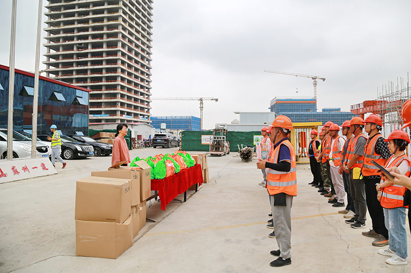 清凉一夏,幸福安康,19日上午,工业园区总工会副主席贡小静带队前往集团公司承建的“新加坡中心”项目现场,看望慰问在岗一线职工,送上夏季安康慰问礼包,并向他们致以诚挚的问候。