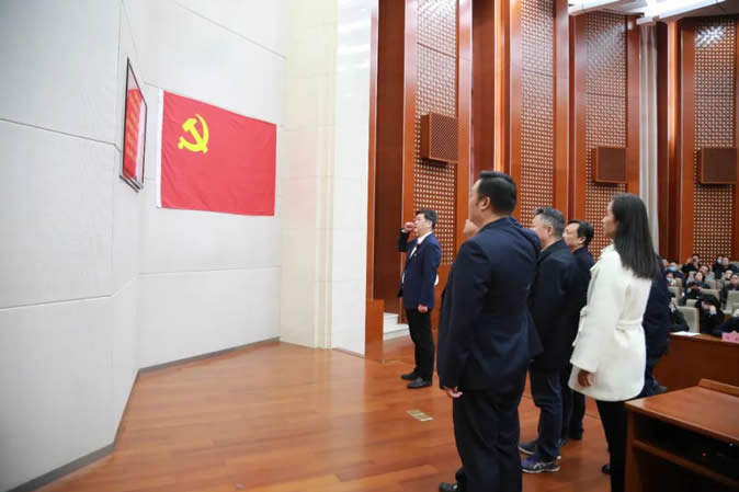 新当选党委书记韩伟领誓,新一届党委成员面向鲜红的党旗,庄重举起右拳,集体重温入党誓词。